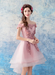 Chic Pink Lace Applique High Low Off Shoulder Party Dress Homecoming Dress Prom Dress