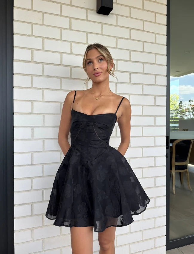 Cute A Line Spaghetti Strap Printed Floral Black Tulle Short Homecoming Dress Outfits