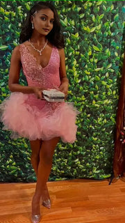This charming pink homecoming dress features a delicate V-neckline and a short silhouette, perfect for celebrating special occasions. Crafted with shimmering sequins and soft tulle, it offers a playful yet elegant look. The ruffled details add texture and movement, making it an ideal choice for birthdays or festive events where you want to stand out with subtle sophistication.