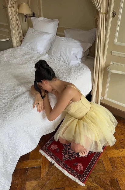 This charming yellow dress features a flattering A-line silhouette with delicate tulle fabric, creating a light and airy look. The spaghetti straps and waist suspenders add a playful yet elegant touch, perfect for birthdays or homecoming events. Its short length ensures comfort and ease of movement, making it an ideal choice for festive occasions where style and comfort matter.