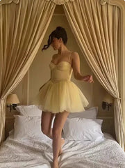 Cute Yellow Waist Suspender Tulle A-line Spaghetti Straps Short Birthday Homecoming Dress
