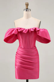 Fuchsia Satin Off The Shoulder Ruffled Pleated Tight Short Homecoming Dress Lovely Party Dress