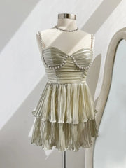 Elevate your homecoming look with this gold metallic dress featuring delicate spaghetti straps and a tiered A-line silhouette. The ruffled layers add dynamic movement, while intricate beading enhances its sophisticated charm. Designed for comfort and style, this short dress is perfect for making a memorable entrance at any special event.
