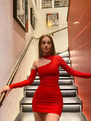 This handmade red dress features long sleeves and stylish cut-out details, combining elegance with a modern edge. Its short length makes it perfect for homecoming, prom, or any party, offering a chic and confident look. Crafted with attention to detail, this dress ensures a flattering fit and standout style for your special occasion.