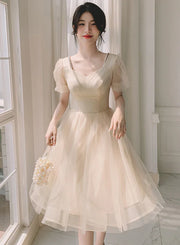 Light Champagne Tulle With Beaded V Neck Short Homecoming Dress Prom Dresses