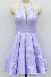 Lilac Homecoming Dresses with Pocket Halter Short Jacquard Floral Graduation Dress