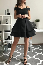 Lovely Black V Neck Spaghetti Straps Off Shoulder Layered A Line Short Prom Dress Homecoming Dress