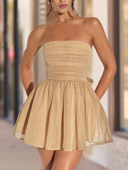 Gold Glitter Tulle Pleated A Line Strapless Ruffle Short-Mini Homecoming Dresses With Bow
