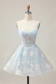 Lovely Light Blue Lace Floral V Neck A-Line Corset Short Homecoming Dress With Sequins