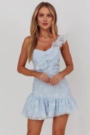 Lovely One-Shoulder Ruffle Floral Prints Blue Mini Homecoming Dress is a charming choice for special occasions. It features a stylish one-shoulder design that elegantly highlights the neck and shoulder, adding a touch of sophistication. The dress is adorned with delicate ruffle detailing and lovely floral prints, creating a playful and feminine look. Crafted in a soft blue hue, the short-length dress showcases a flirty silhouette. The ruffled hem adds movement and charm, making it perfect for dancing and socializing.