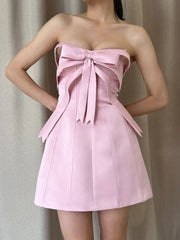 This elegant pink satin homecoming dress features a strapless, A-line silhouette that flatters every figure. The short length offers a youthful, playful vibe, while the lace-up back ensures a customizable fit. A delicate bow accent adds a charming finishing touch, making this dress perfect for a memorable evening. Crafted with attention to detail, it combines comfort and style for confident wear throughout your special event.