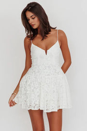 Lovely Spaghetti Straps V-wire Lace White Mini Homecoming Dress is a romantic and elegant choice. It features delicate spaghetti straps that elegantly support the dress while showcasing the shoulders. The V-wire neckline adds a touch of allure, creating a flattering and feminine look. The dress is adorned with intricate lace detailing all over, adding a sense of sophistication and timeless charm. The mini length gives it a youthful and playful vibe.