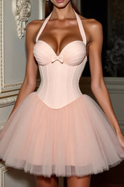Off Shoulder Blush Halter Corset Short Homecoming Dress With Bow
