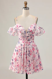 Pink Floral Pleated V Neck Spaghetti Straps A Line Cold Shoulder Short Homecoming Dress
