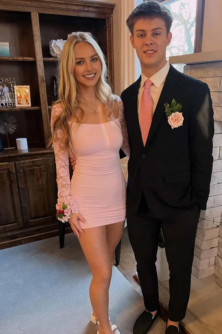 Pink Lace Square Neck Long Sleeves Pleated Scoop Neck Mini Homecoming Party Dress