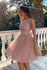 Pink round neck tulle sequin short prom dress retract your waist cocktail dress