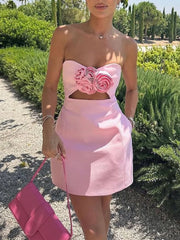 Pink Satin 3D Flowers Sheath Strapless Cutout Lace-up Back Short Homecoming Dresses