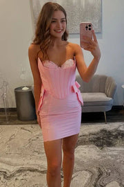Pink Satin Appliques Pleats Tight Sweetheart Collar Strapless Homecoming Dress With Bow - US 2 / UK 6 / EU 32
