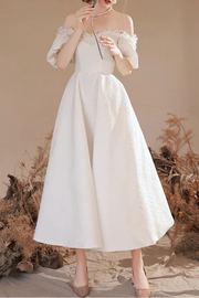This elegant off-shoulder prom dress features a flattering A-line silhouette and a tea-length hem, crafted from a comfortable blended fabric. Its classic white color and refined design make it an ideal choice for homecoming or formal parties, offering both style and ease of movement for a memorable evening.