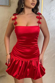This red satin party dress features an elegant A-line silhouette with delicate straps adorned by bows, enhancing its feminine charm. The square neckline and pleated short skirt create a flattering, structured look perfect for homecoming or special occasions. Crafted to combine style and comfort, this dress offers a sophisticated yet playful option for your event wardrobe.