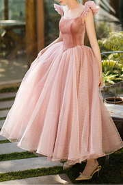 This retro-inspired prom dress features a flattering A-line silhouette crafted from soft pink velvet and delicate tulle. The U-neck and short sleeves offer a timeless elegance, while the tea-length skirt adds a graceful, princess-like charm. Perfect for homecoming or special occasions, this dress combines classic style with comfortable wearability.