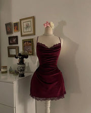 Sexy Burgundy Velvet Lace spaghetti strap Pleats Short Homecoming Dress