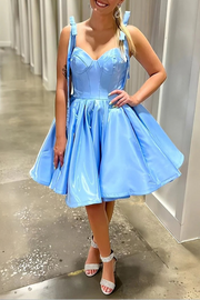 Simplicity Blue Satin Pleated Spaghetti Straps A Line Short Homecoming Dresses With Bow - Blue / US 2 / UK 6 / EU 32