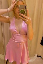 Simplicity Pink Satin Halter V-Neck Open Back A-Line Empire-Waist Mini Homecoming Dress