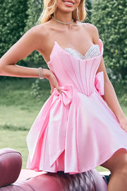 Sparkly Strapless Pink Corset A Line Short Homecoming Dress With Bow