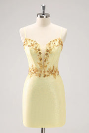 Sparkly Yellow Spaghetti Straps Corset Slim-fit Tight Short Homecoming Dress