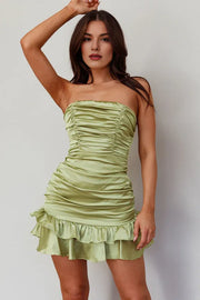 Strapless Pleated Tied Back Frill Hem Satin Olive Mini Homecoming Dress