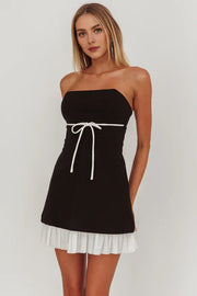 Strapless String Tie Black Mini Homecoming Dress With Ruffle-trimmed Hem is a standout choice for special occasions. It features a strapless design that elegantly showcases the shoulders and collarbone, adding a touch of allure. The string tie at the waist creates a flattering silhouette by cinching in the waist. The ruffle-trimmed hem adds a playful and feminine touch, enhancing the dress's overall charm with its delicate layers. The classic black hue is timeless and versatile, exuding a sense of sophistication and elegance.