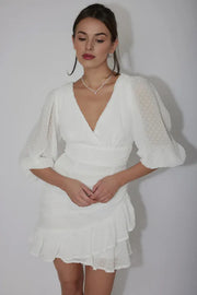 Step into elegance with this V Neck 1/2 Sleeve Pleated Ruffle Hail Spot White Mini Homecoming Dress. It features a flattering V-neckline, stylish 1/2 sleeves with a delicate hail spot pattern, and charming pleated ruffle details that add a feminine touch. The mini length brings a youthful vibe, while the open back design adds a hint of allure.