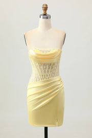 Yellow Satin Floral Lace Strapless Corset Tight Short Homecoming Dress With Lace-Up Back