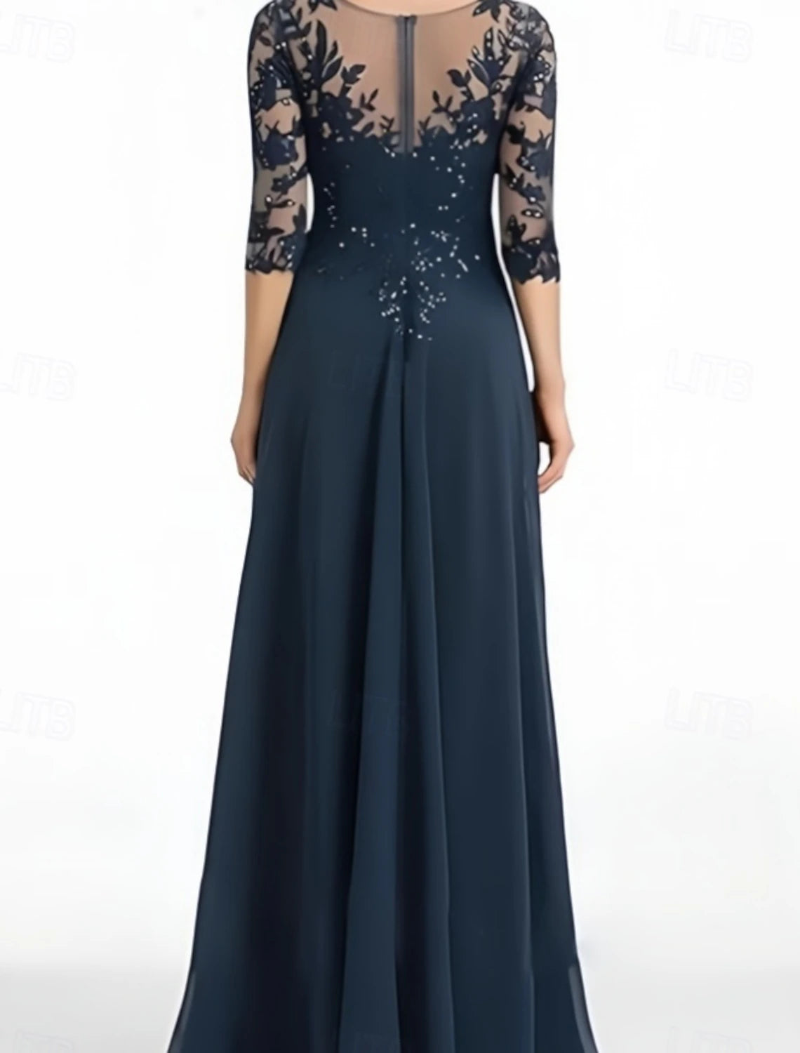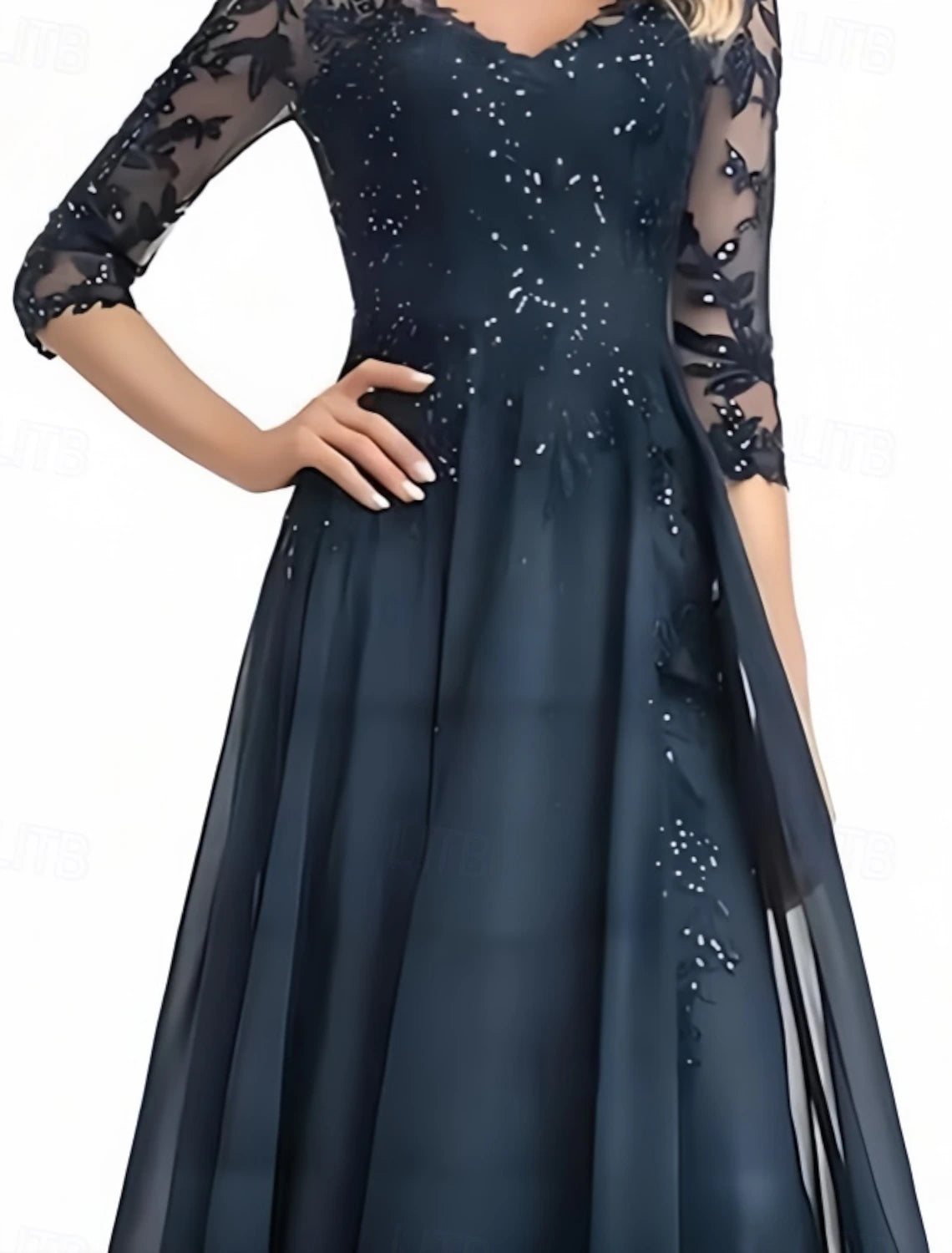 A-Line Mother of the Bride Dress Wedding Guest Elegant V Neck Floor Length Chiffon 3/4 Length Sleeve with Beading Appliques