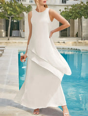Beach Wedding Sheath Mother of the Bride Dress Elegant Simple Jewel Neck Ankle Length Stretch Chiffon Sleeveless with Tier Solid Color