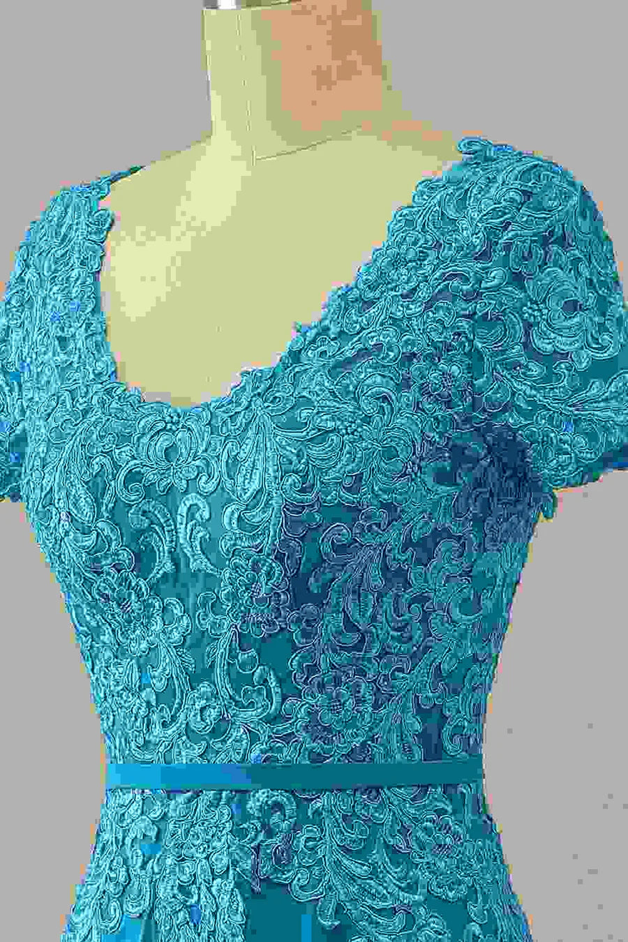 Blue Lace Princess-seamed Sweetheart BodiceShort Sleeve Long Mother of the Bride Dress