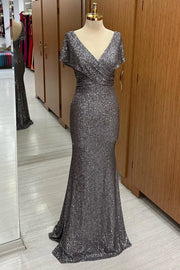 Gray Sequin Surplice Neck Open Back Mermaid Floor Length Mother of the Bride Dress - US 2 / UK 6 / EU 32
