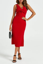 V Neck Knot Front Slim-fit Exquisite tailoring Midi Dress In Red