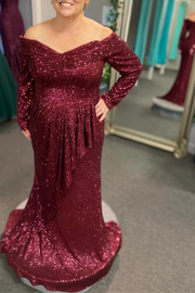 Wine Red Sequin Off-the-Shoulder Long sleeves Ruffle Floor Length Mother of the Bride Dresses