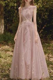 This elegant long prom dress features delicate pink tulle layered with intricate lace and applique details, creating a refined and feminine silhouette. The A-line cut flatters a variety of body shapes, offering comfort and grace for evening events or parties. Perfect for making a sophisticated statement, this dress combines classic design with exquisite craftsmanship.