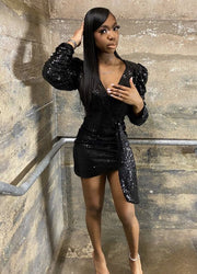 Black V Neck Long Sleeve Sequins Short Party Dress 16th Birthday Homecoming Dress