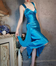 Elegant A Line Straps Blue Satin Party Dress Sleeveless Evening Dress