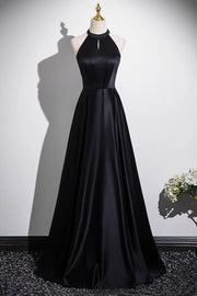 This elegant black satin prom dress features a halter neckline and a floor-length A-line silhouette, combining classic style with modern sophistication. Its smooth satin fabric offers a luxurious feel and graceful drape, perfect for evening events and formal parties. The design ensures comfort and flattering movement, making it an ideal choice for special occasions where timeless elegance is desired.
