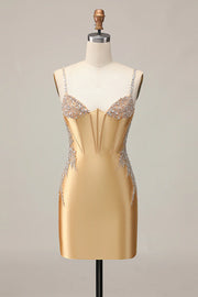 Golden Bodycon Corset Beaded Lace Up Short Homecoming Party Dress With Rhinestones - Golden / US 2 / UK 6 / EU 32