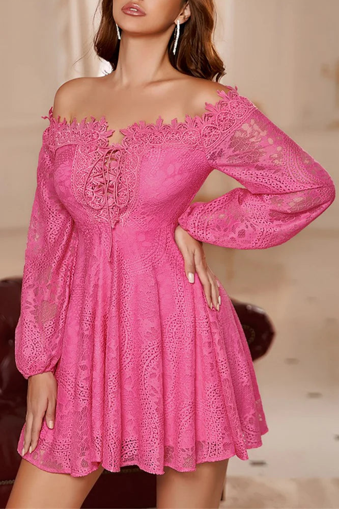This off-white party dress features delicate lace fabric with an off-the-shoulder neckline and long sleeves, offering an elegant yet modern silhouette. The open back design adds a touch of allure, while the A-line cut ensures a flattering fit. A lace-up detail enhances adjustability and style, making it an ideal choice for special occasions where sophistication and comfort are key.
