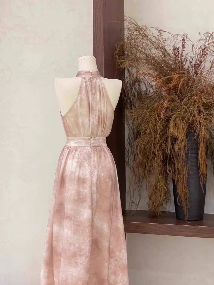 Sexy A Line Halter Ruffled Pink Long Women's Retract Your Waist Party Dresses