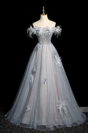 Shiny Gray Blue Tulle Off the Shoulder Sequins Long Prom Dress Evening Party Dress
