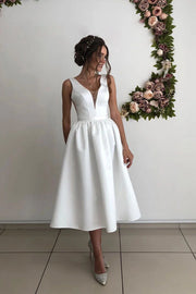 Simple v neck satin bridesmaid dress, tea length prom dress