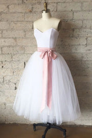 Simple white tulle tea Length prom dress, Off shoulder bridesmaid dress